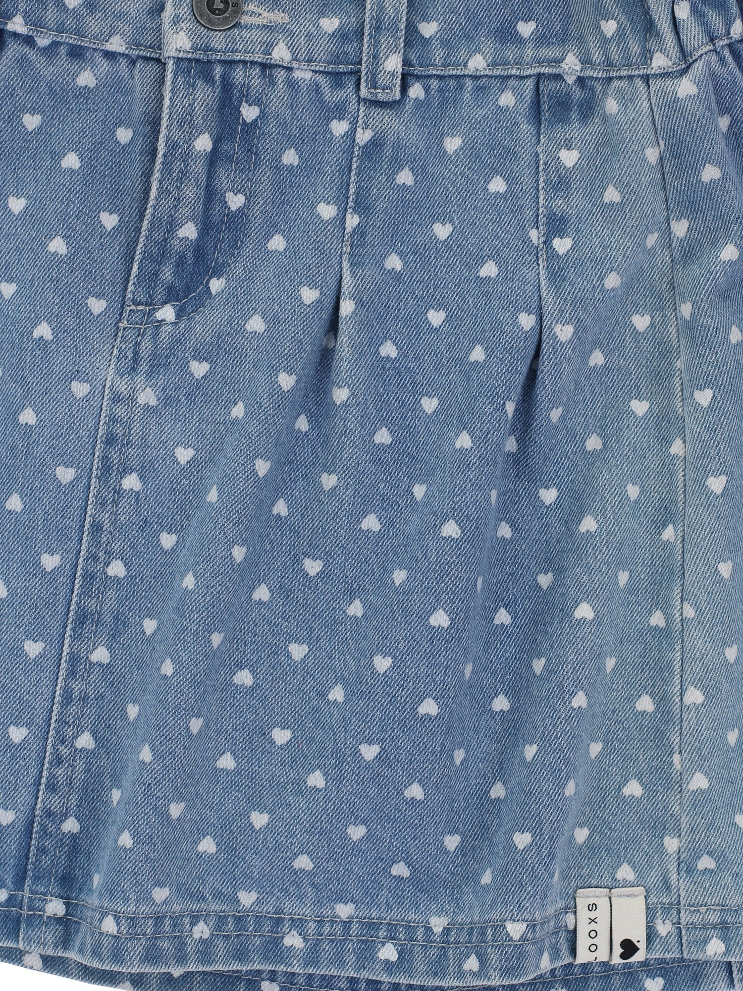 Pretty in Denim! Te gek denim rokje met een all-over bleached hartjes dessin. Elastische tailleband op de rug. Sluit met een haakje en een oogje en een rits.